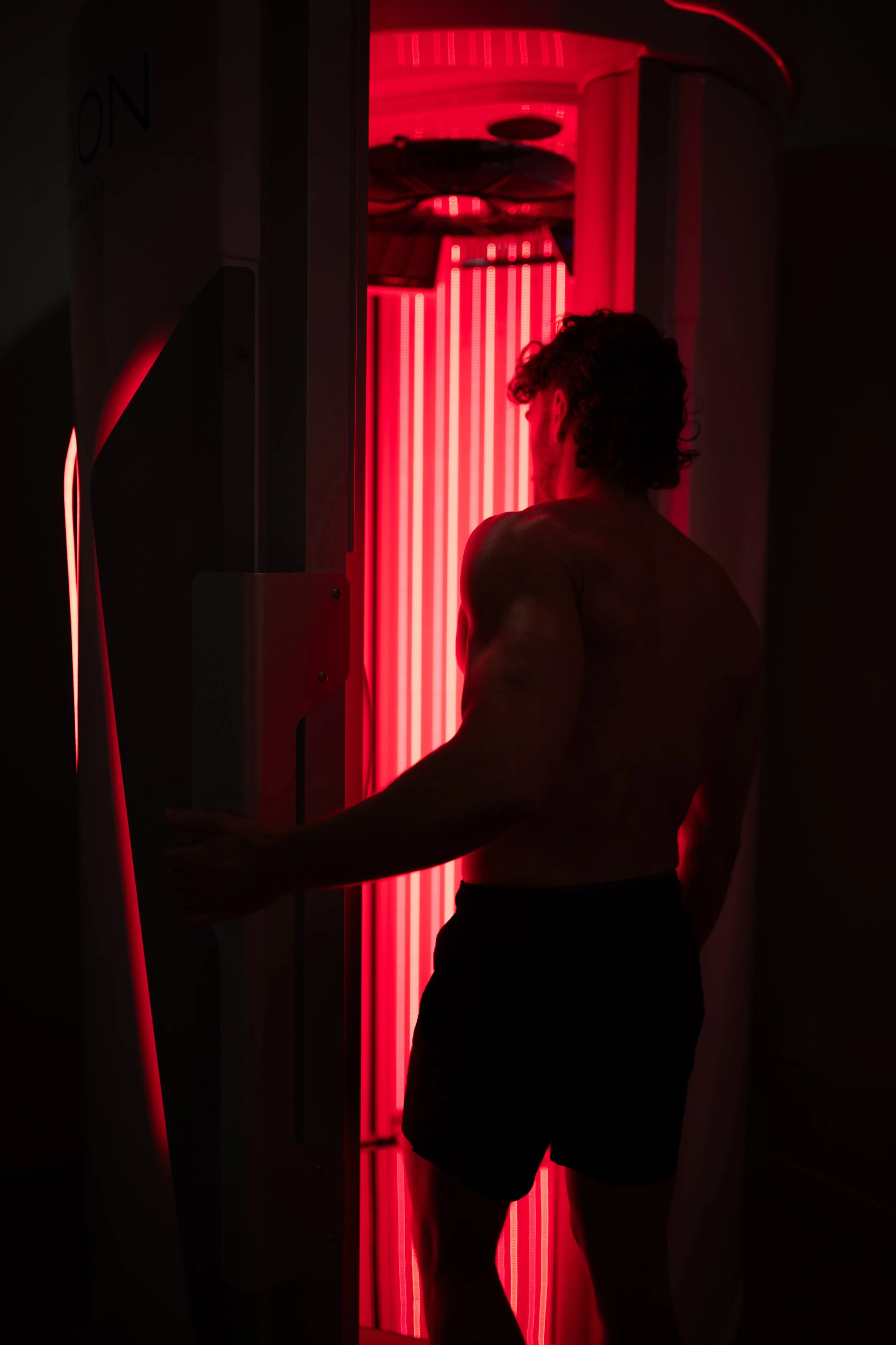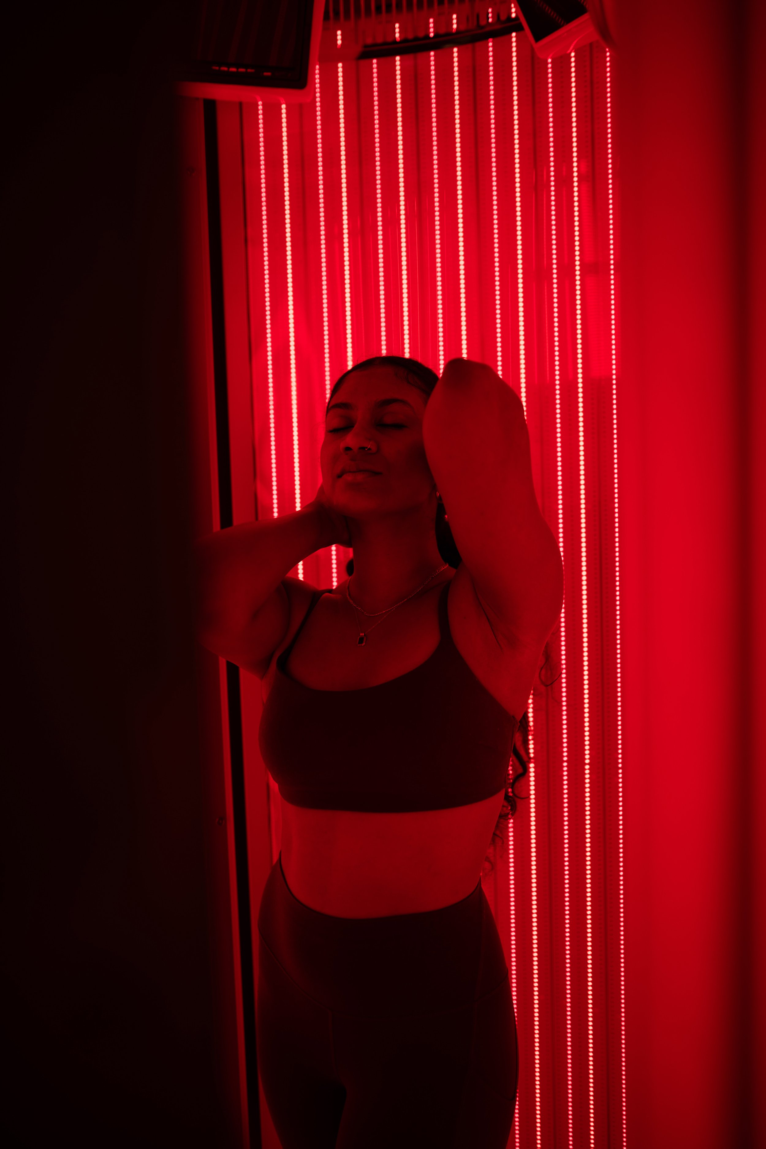 Relax in a private 360-degree red light therapy booth, designed to support skin health, recovery, mood, stress regulation, and overall wellbeing